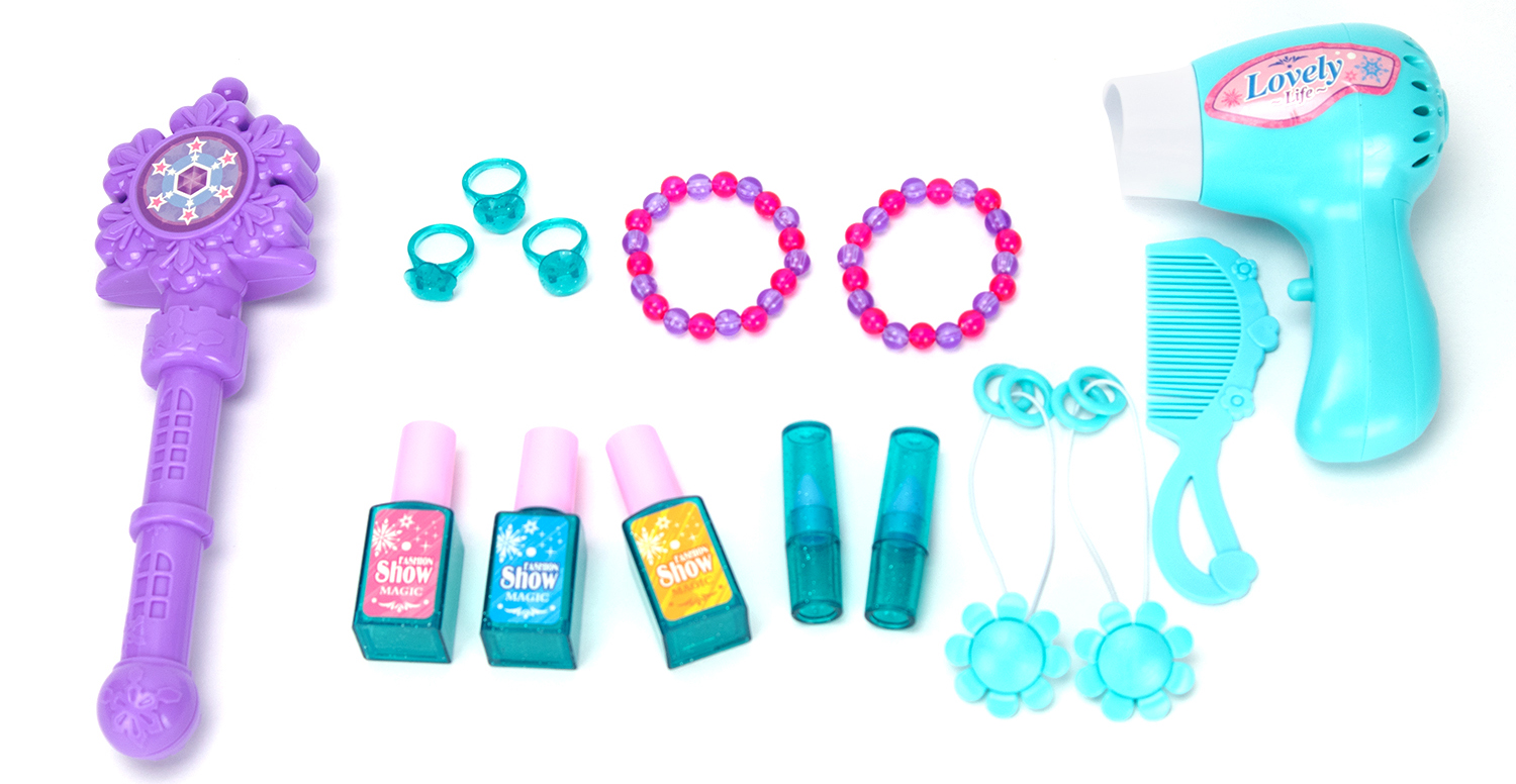 В комплекте есть всё для игры в парикмахера: расчески, игрушечные ножницы, флакончики из-под шампуня и украшения для маленьких модниц.