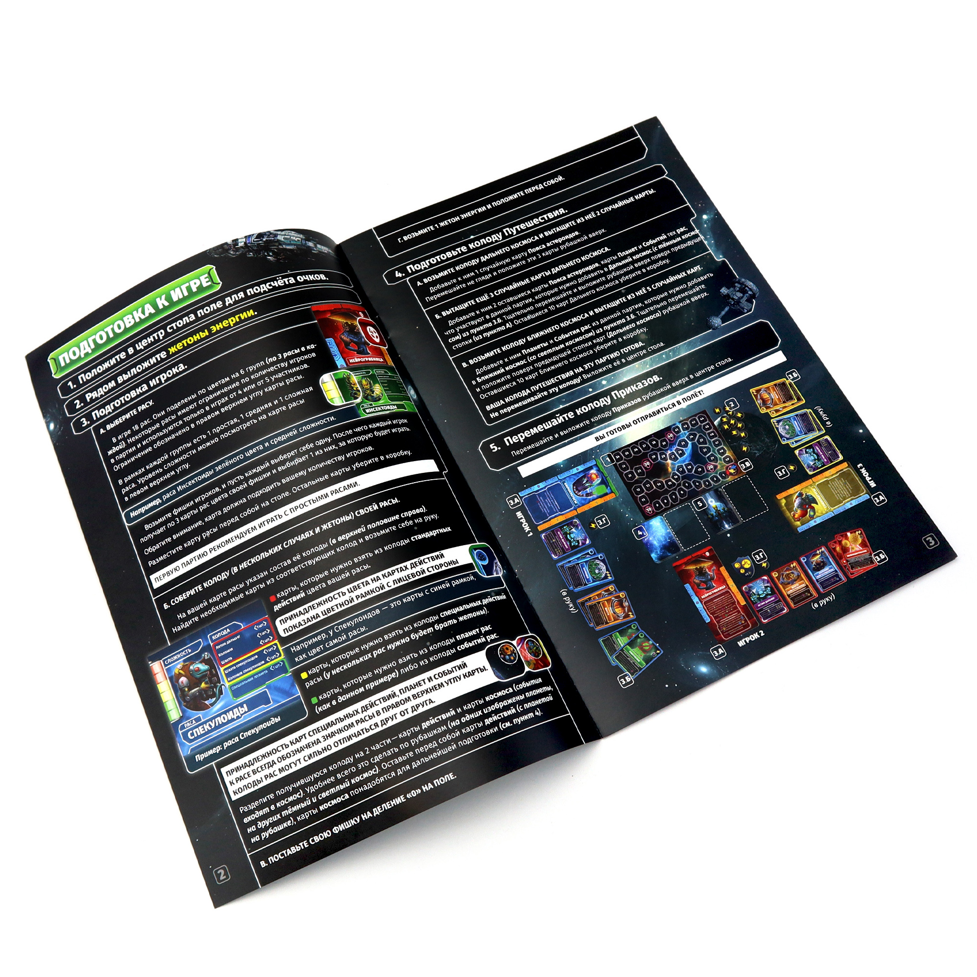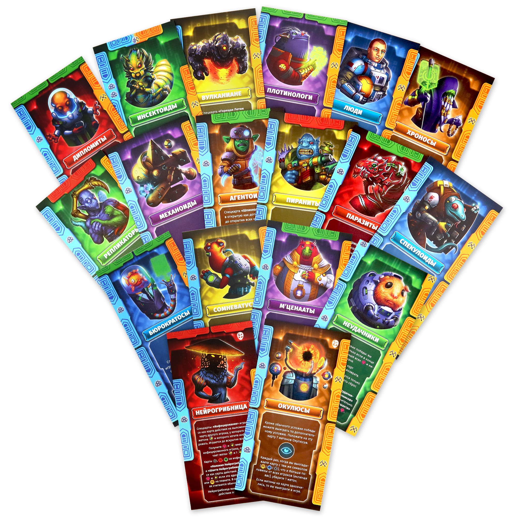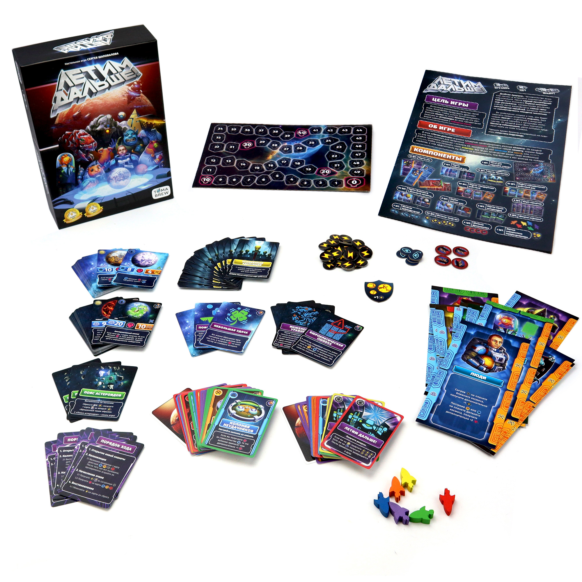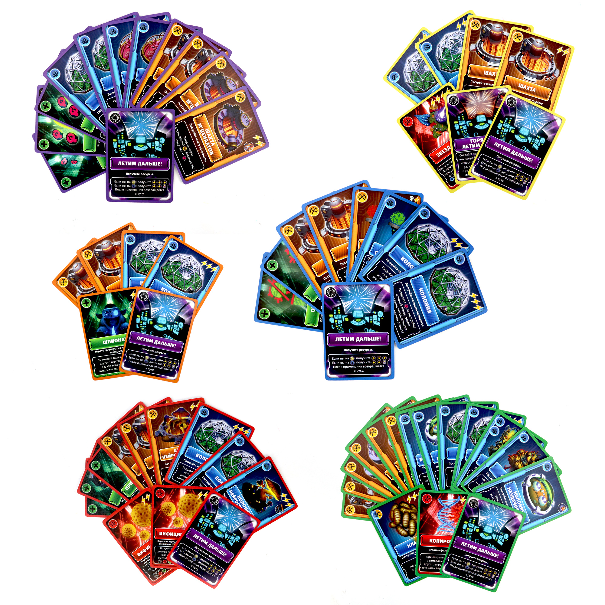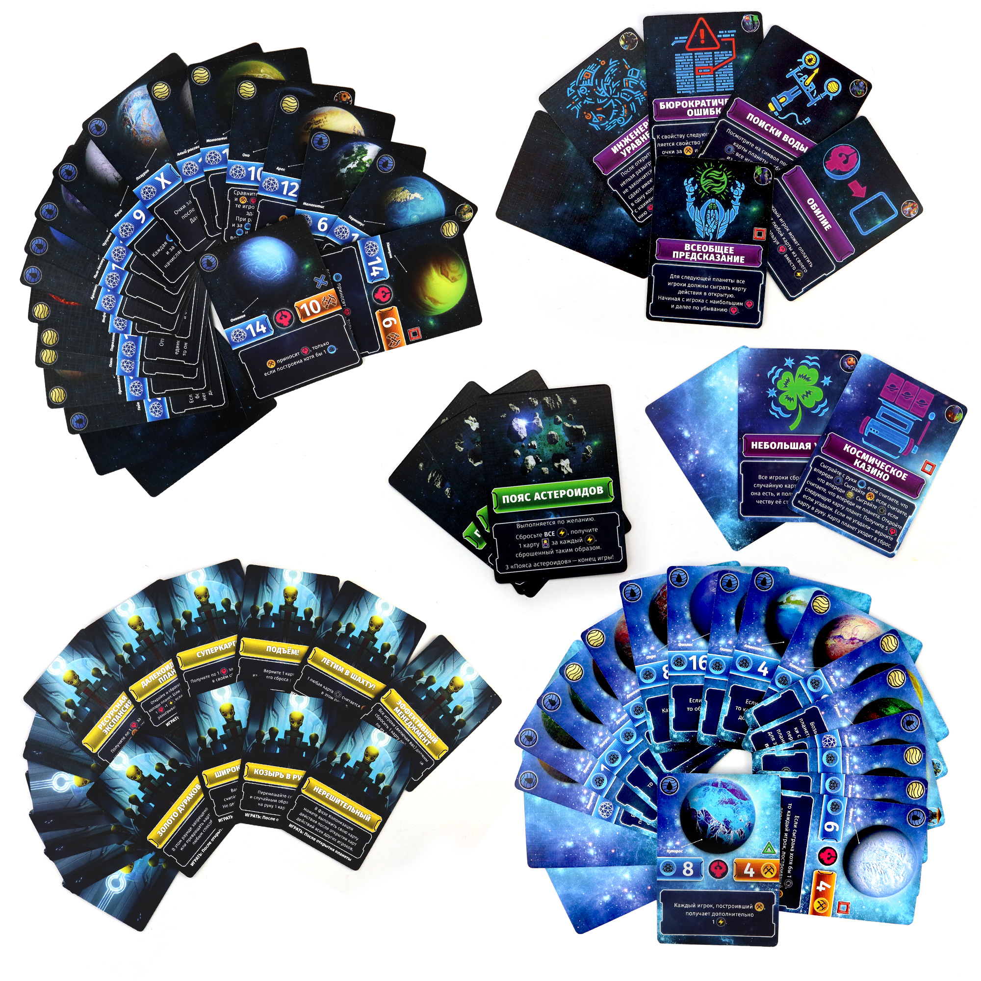 Производитель позаботился о том, чтобы игроки получили действительно насыщенный игровой опыт. В коробке с игрой вы найдете множество красочных компонентов, включая больше 100 уникальных карт действий и планет . Полный состав настольной игры впечатляет своим разнообразием :