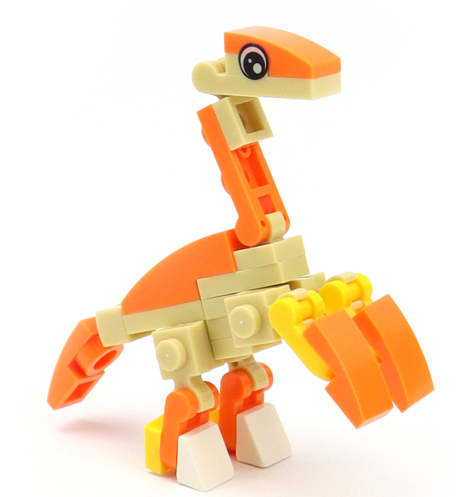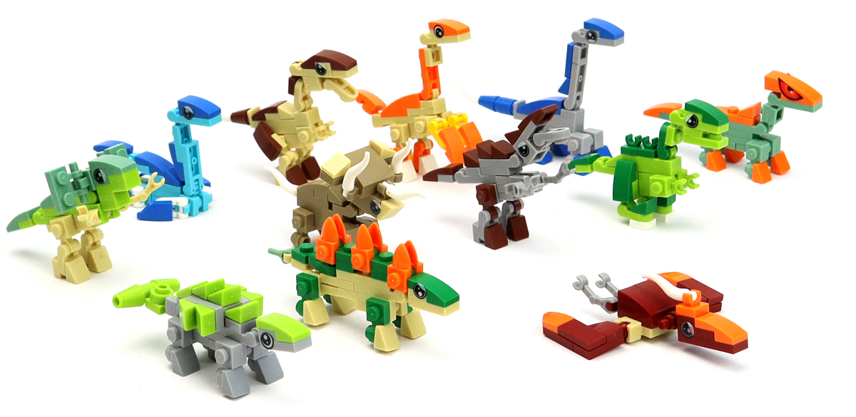В комплект входит 12 мини-наборов с деталями для сборки отдельных фигурок травоядных и хищных динозавров по понятной инструкции, а также наклейки для оформления глаз.